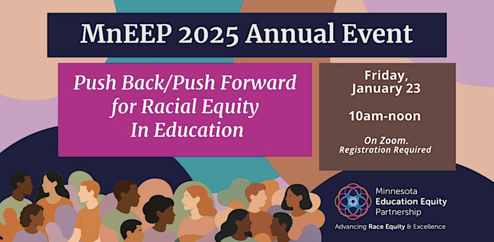 You’re invited to join Minnesota Education Equity Partnership (MnEEP) and our partners across K-12, higher education, nonprofit, parent, student, and racial justice communities for Push Back / Push Forward for Racial Equity in Education—a virtual event to celebrate our collective work and deepen the shared power, meaningful relationships, and solidarity we need to push back against injustice in education and push forward toward the racially just public education system every student deserves.