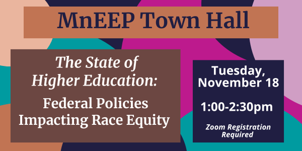 Join Minnesota Education Equity Partnership (MnEEP) and the University of Minnesota for The State of Higher Education: Federal Policies Impacting Race Equity virtual town hall, a timely discussion on how federal decisions are shaping equity, access, and opportunity in higher education.